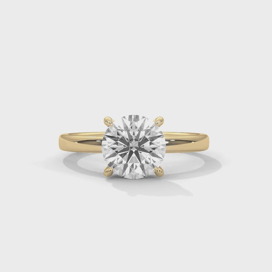 Diamant rond de laboratoire (environ 8 mm, proche de 2 carats), couleur E-F-G, pureté de VS1 à SI2, serti de 4 griffes pour un maximum de lumière.